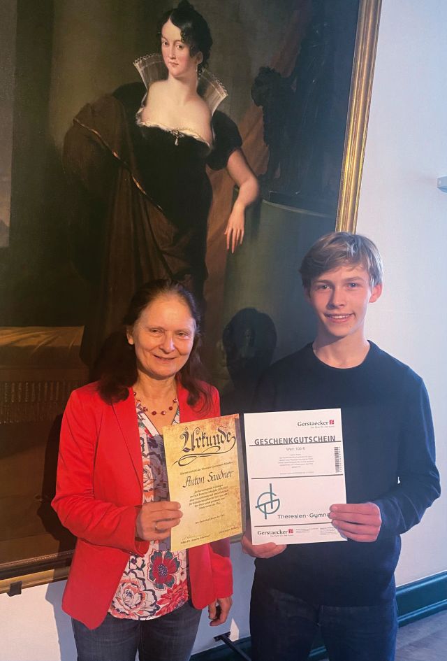 Seit 2020 wird der sog. Theresien-Kunstpreis am Ende des Schuljahres für hervorragende Leistungen im Fach Kunst an eine Schülerin bzw. einen Schüler verliehen. Nach den letztjährigen Preisträgerinnen, Ewelin Helldobler (2020) und Lilly Duggan (2021), fällt die Wahl dieses Jahr auf Anton Sandner aus der Q11.